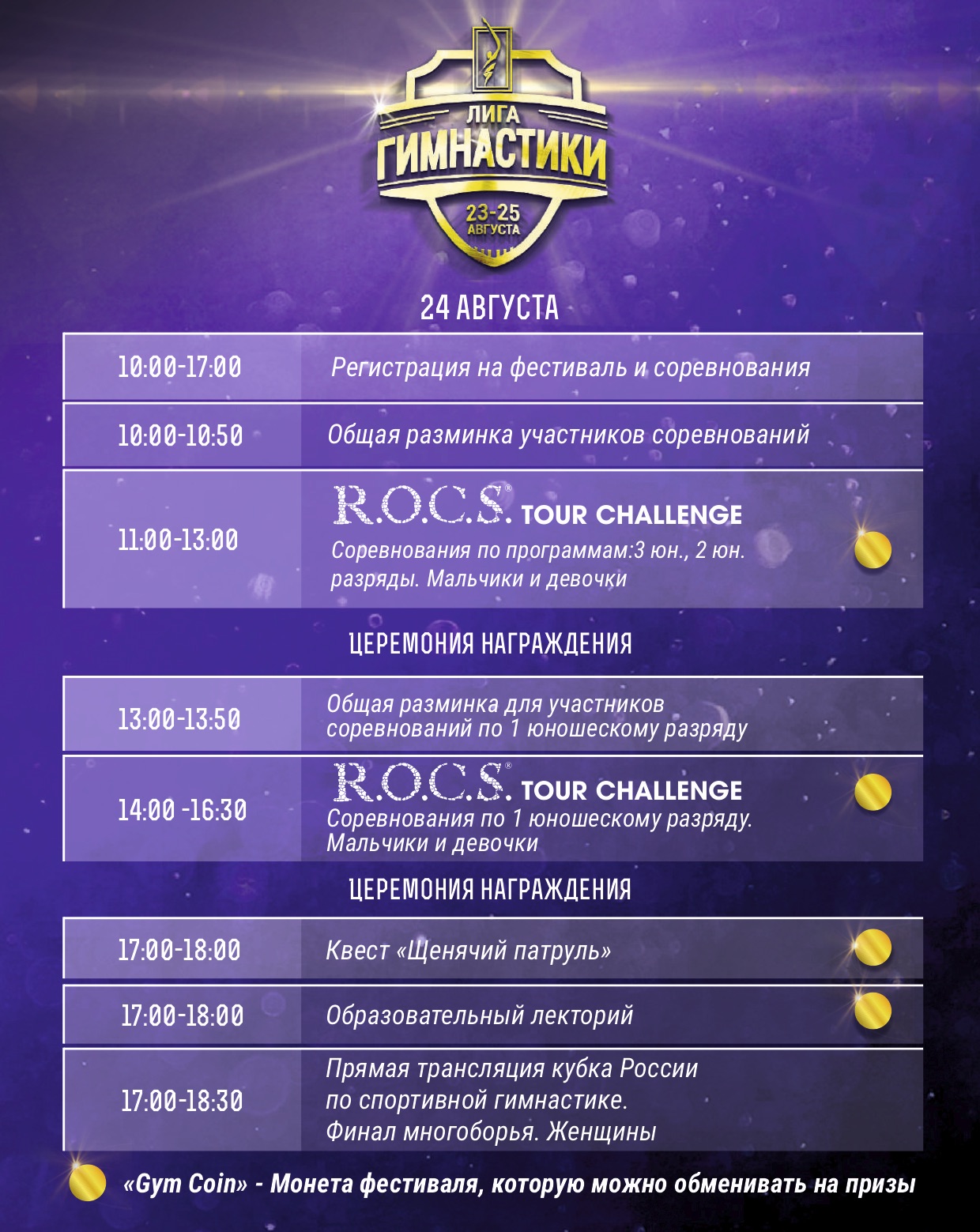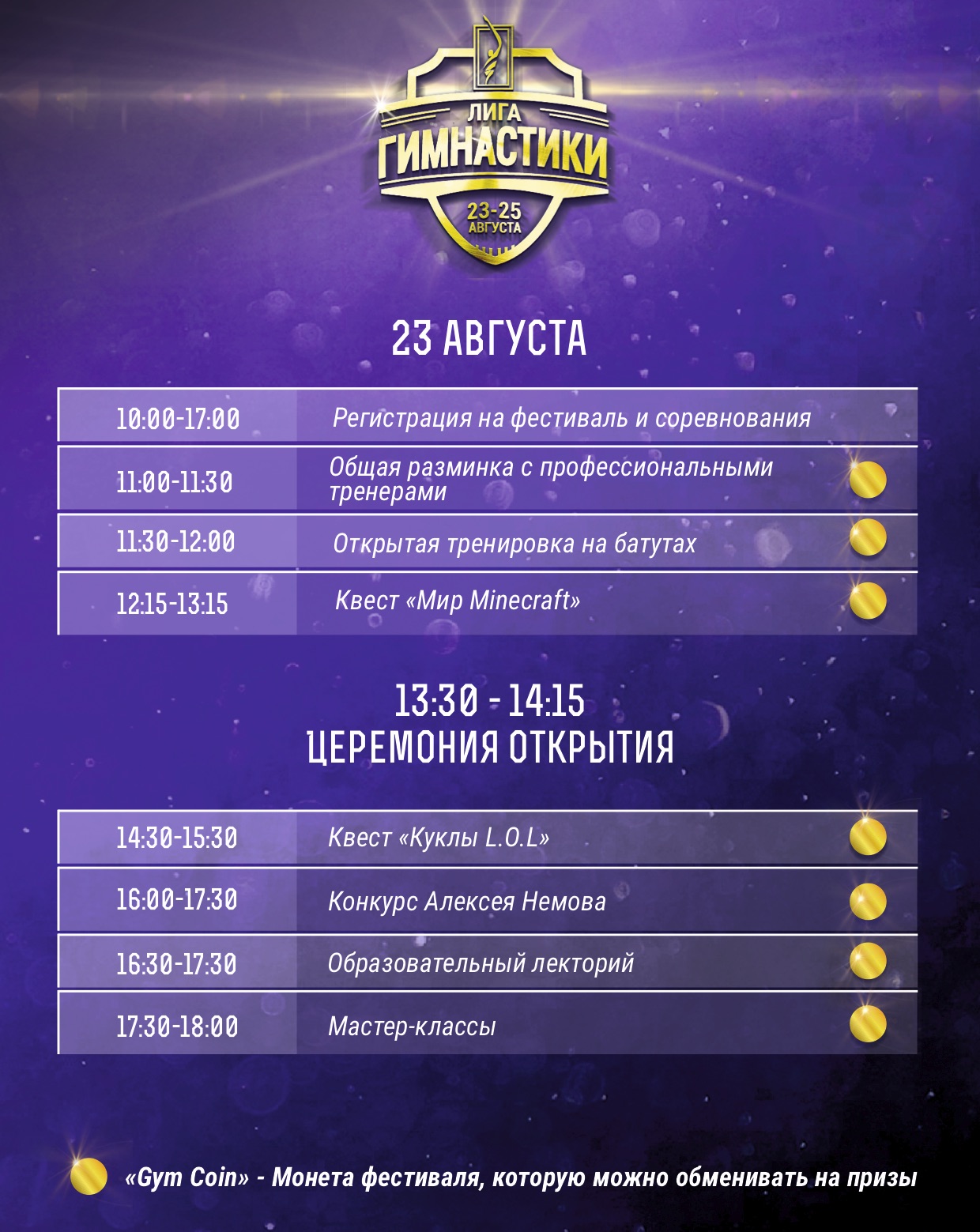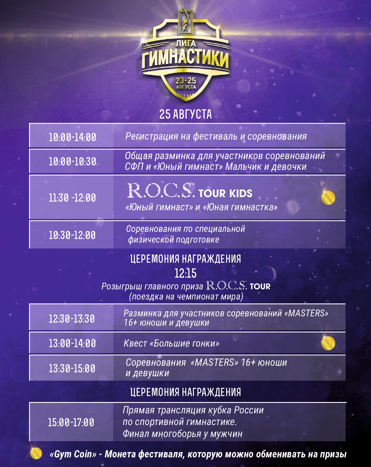 Важной составляющей фестиваля станут соревнования «Лига гимнастики» по программе юношеских разрядов для детей 5 -10 лет (I, II, III юн.разряды и программе «Юный гимнаст»), а также турнир среди любителей «MASTERS» (для участников 16+).