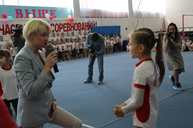 Юные спортсмены задавали знаменитой гимнастке самые каверзные вопросы, на которые она с легкостью отвечала.